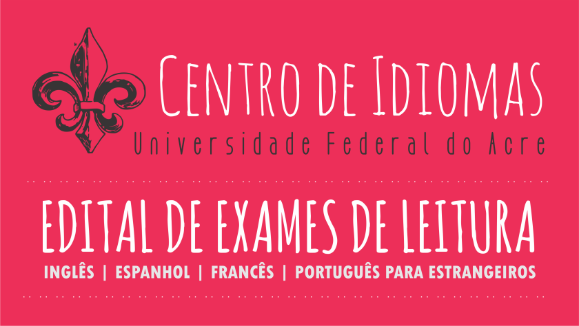 O Programa de Extensão de Ensino de Línguas da Universidade Federal do Acre – Centro de Idiomas da Ufac abre inscrições três vezes ao ano para realização de exames de leitura em Língua Inglesa, Língua Espanhola, Língua Francesa e Língua Portuguesa – para estrangeiros, com 40 (quarenta) vagas para cada língua, sendo 20 (vinte) vagas para comunidade interna e 20 (vinte) vagas para comunidade externa à universidade.