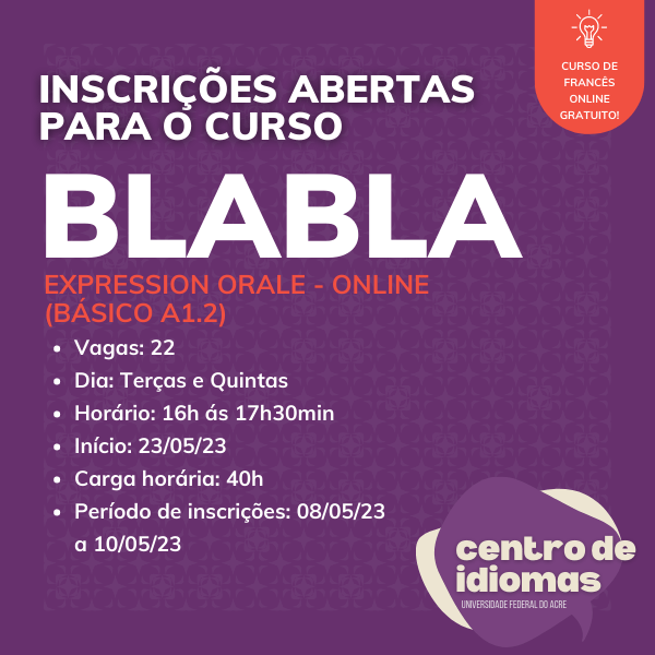 Está aberta a inscrição para o curso online de língua francesa, BLABLA – EXPRESSION ORALE (BÁSICO), que será ofertado nas terças e quintas, das 16h às 17h30min, tendo seu início em 16/05/23 e contendo uma Carga horária de 40h.