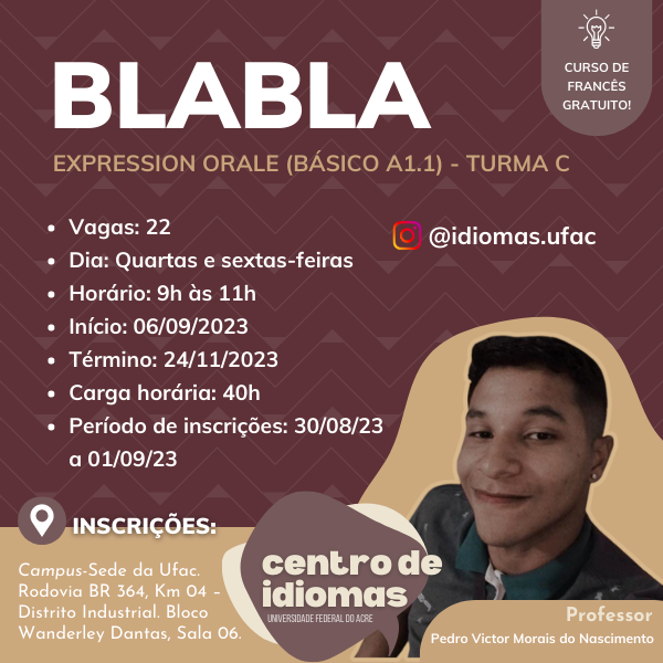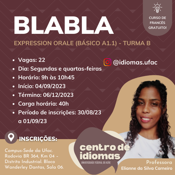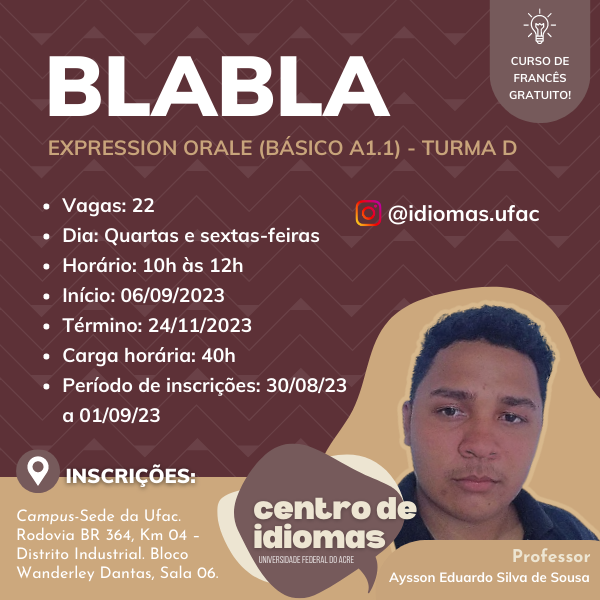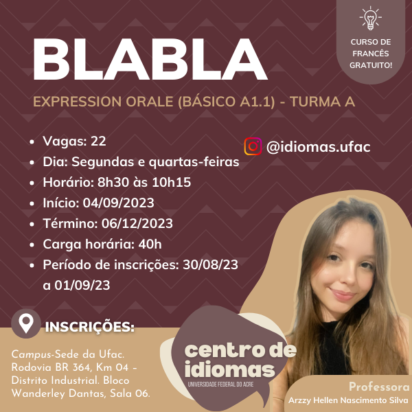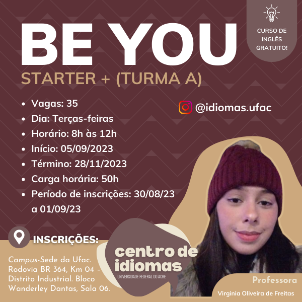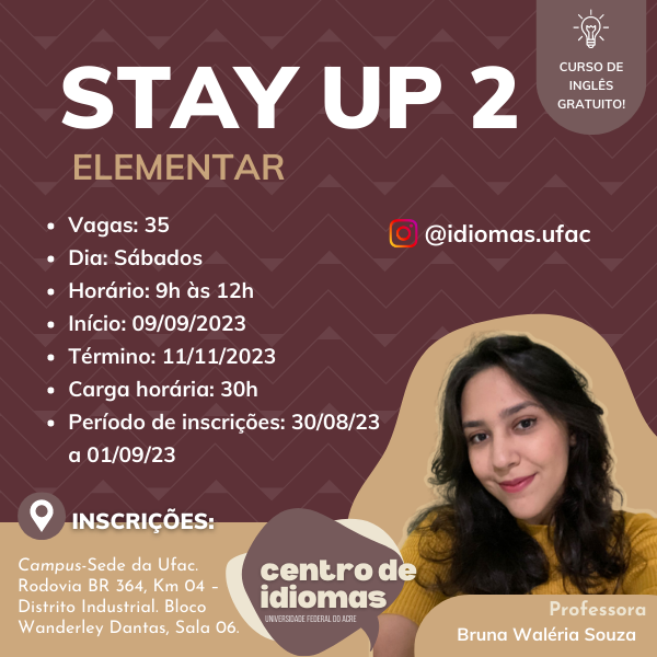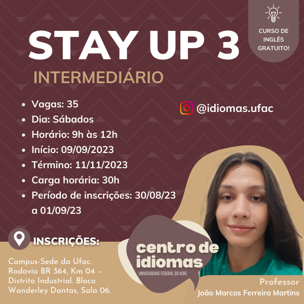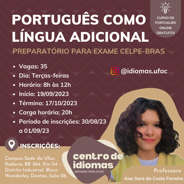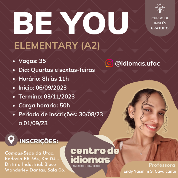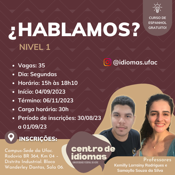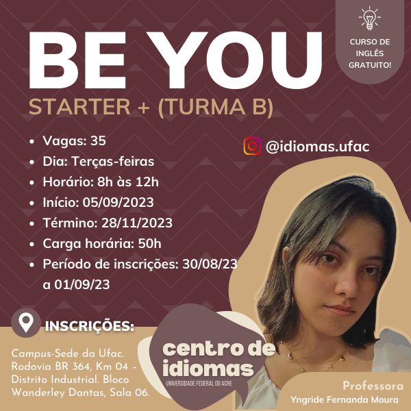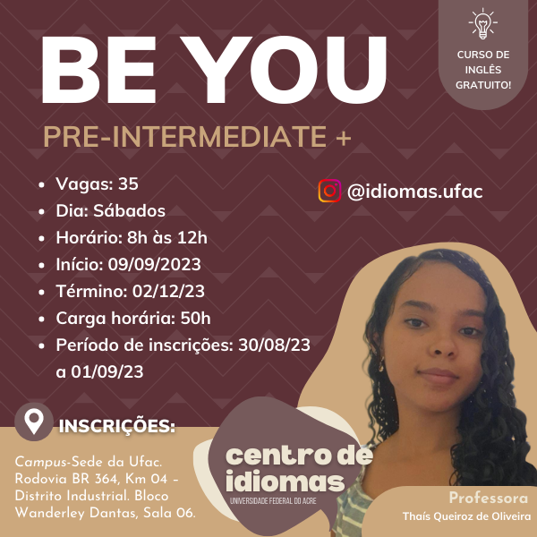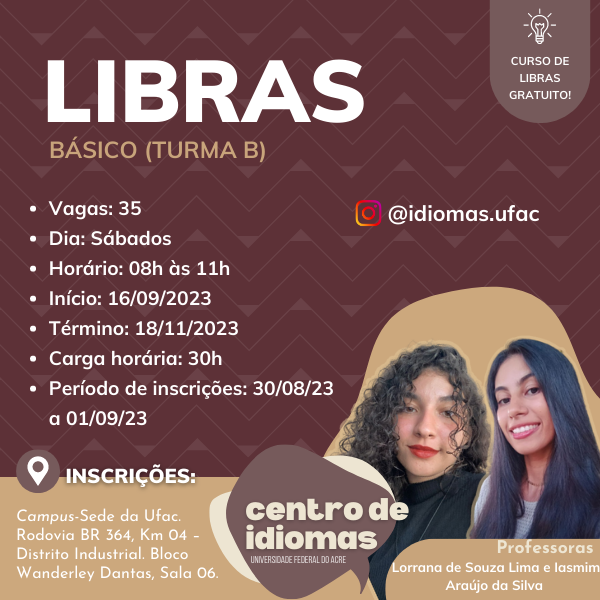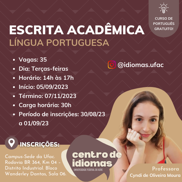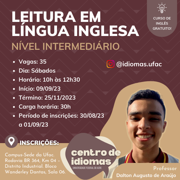 Mais informações pelo e-mail centroidiomas@ufac.br ou WhatsApp: 68 99252-2528