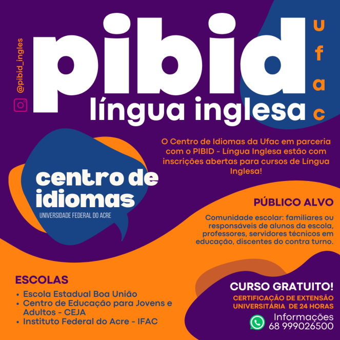 Em parceria com o Programa Institucional de Bolsas de Iniciação à Docência – PIBID, campus Rio Branco, o Centro de Idiomas da Universidade Federal do Acre promove cursos de Língua Inglesa para iniciantes no Centro de Educação de Jovens e Adultos – CEJA, na Escola Estadual Boa União e no Instituto Federal do Acre – IFAC.
