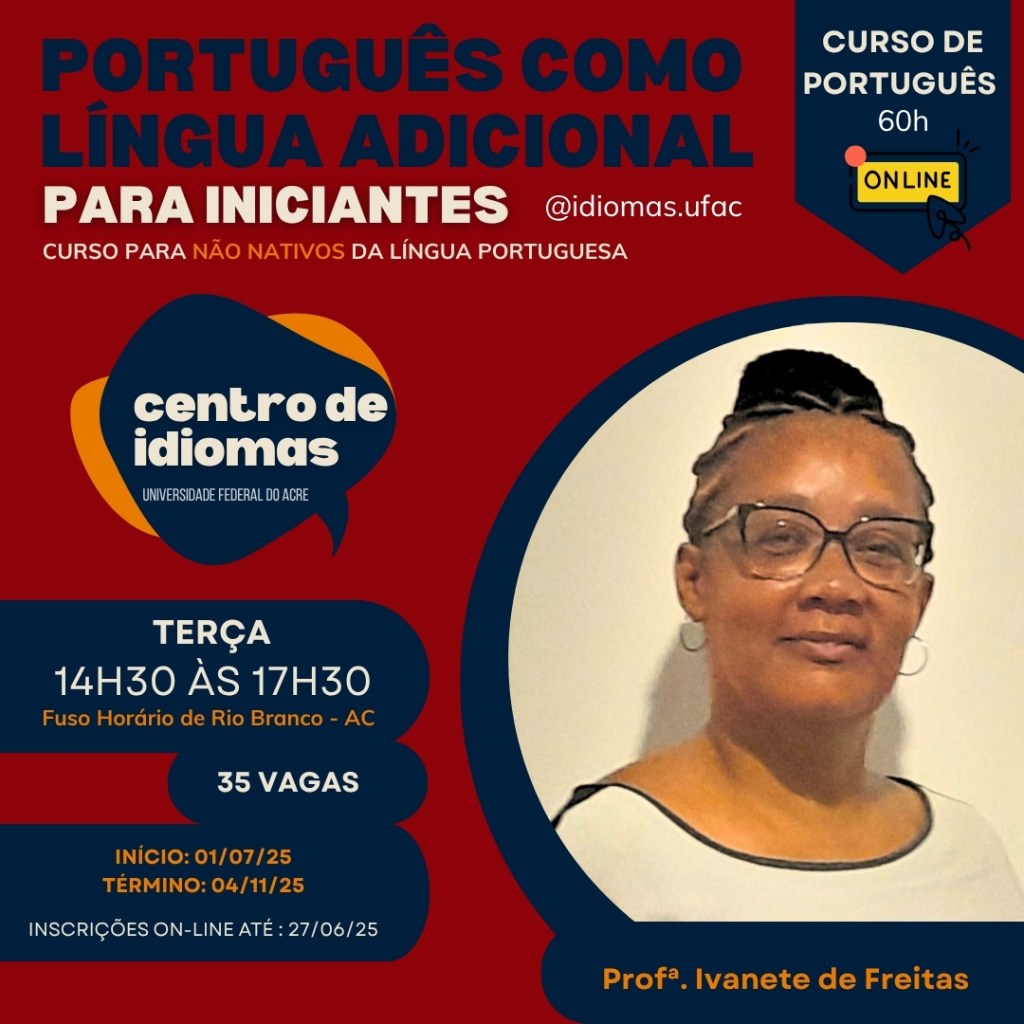 O Centro de Idiomas da Universidade Federal do Acre convida para o Curso On-line de PortuguĂŞs como LĂngua Adicional para Iniciantes, especialmente desenvolvido para nĂŁo nativos da lĂngua portuguesa.