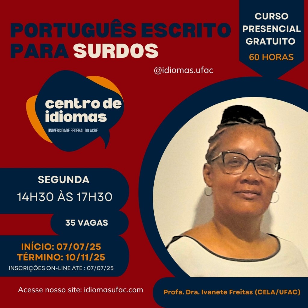 O Centro de Idiomas da Universidade Federal do Acre (UFAC) está com inscrições abertas para o curso “Português Escrito para Surdos”, voltado para a comunidade surda. O objetivo é desenvolver habilidades de escrita em língua portuguesa de forma acessível e inclusiva, com o apoio de dois intérpretes de Libras vinculados ao Núcleo de Acessibilidade e Inclusão (NAI/UFAC).